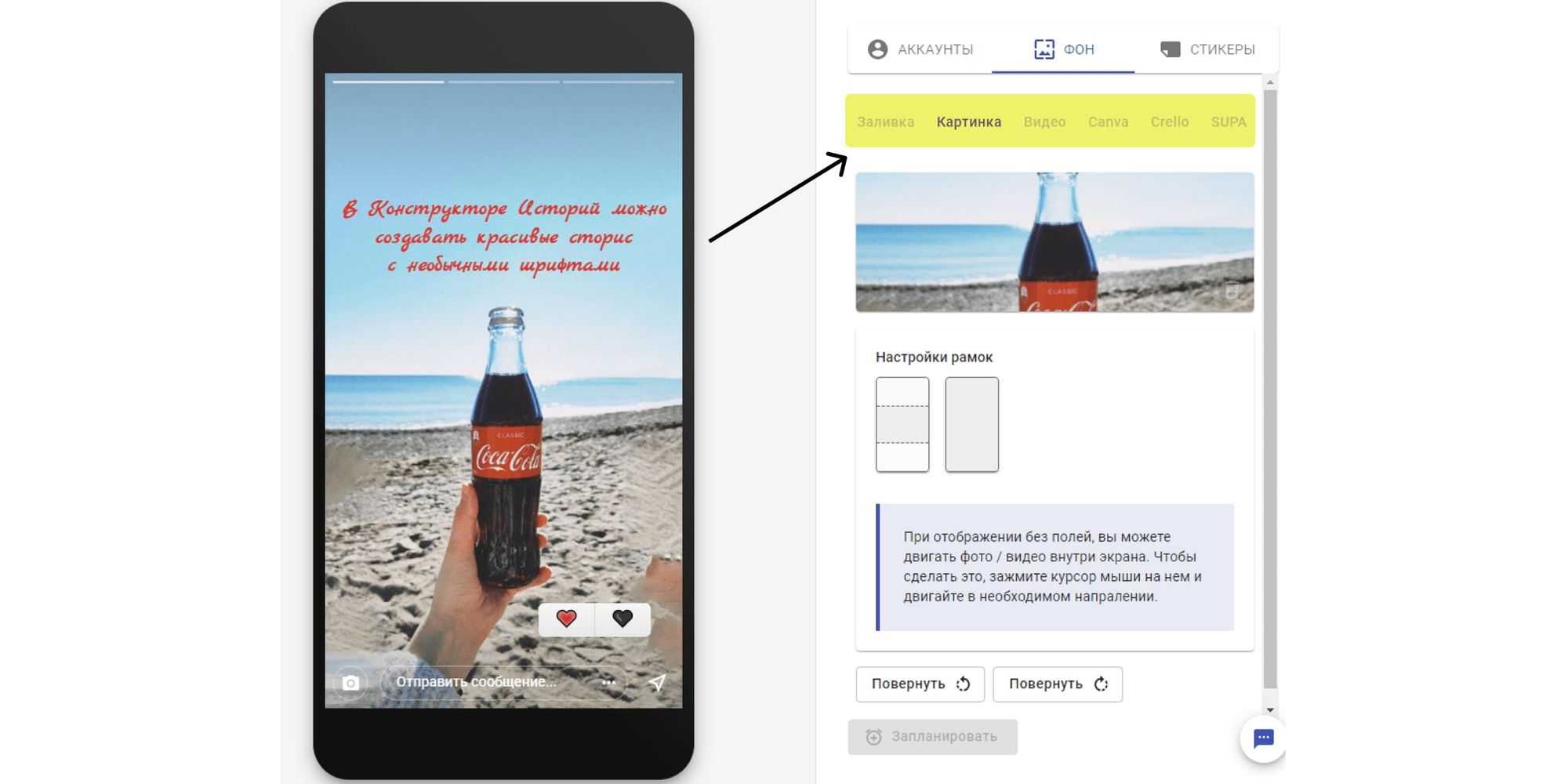 В Конструкторе Историй можно поменять фоновое изображение без потери текста или стикеров, использовать шаблоны напрямую из других сервисов