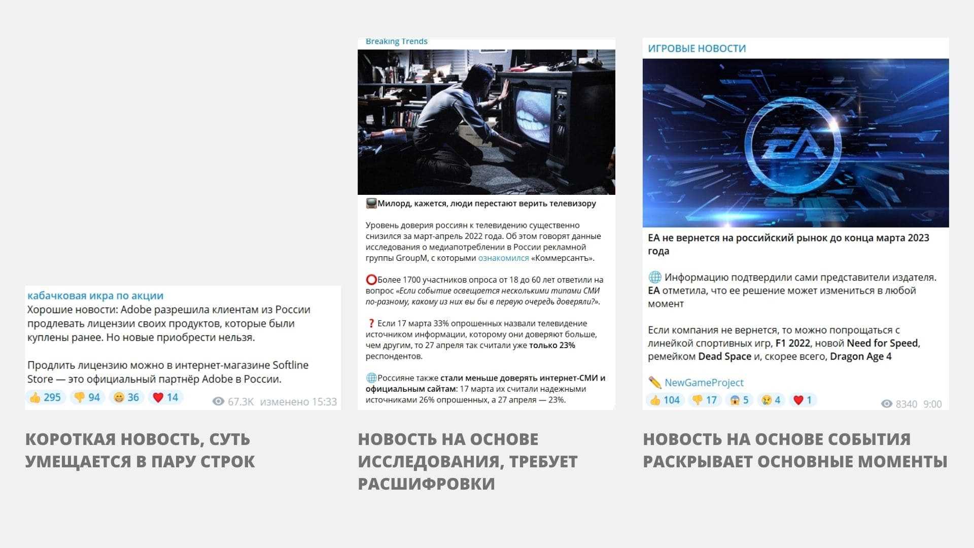 Важно: телеграм-канал – это не СМИ, поэтому необязательно делать новости сухими, как бы от лица серьезного журналиста. Зачастую чем больше личного мнения в новости, особенно не самой свежей, – тем лучше