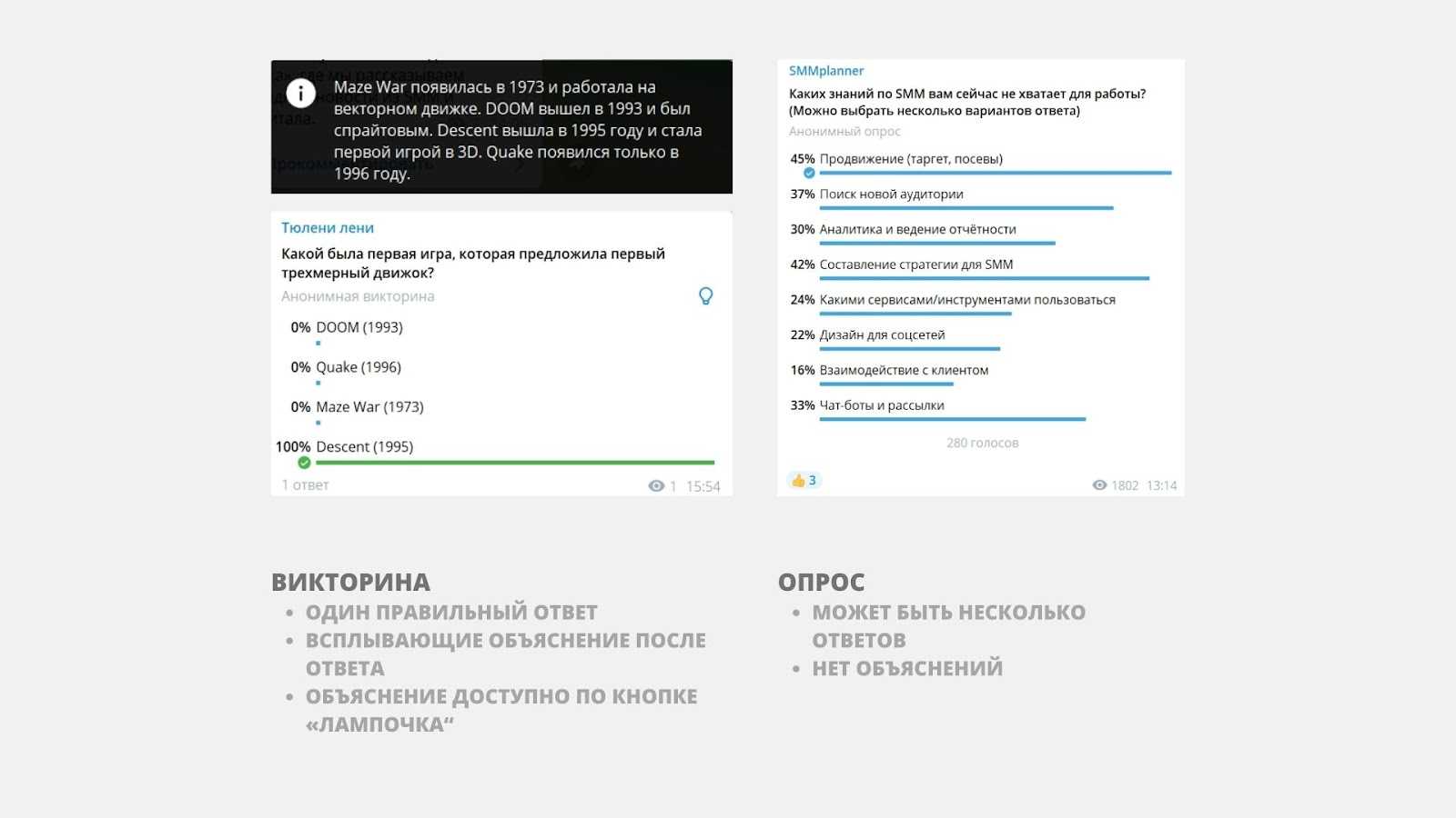 - Опросы. Отдельная публикация для голосования. Доступна викторина с выбором правильного и неправильного ответа.
