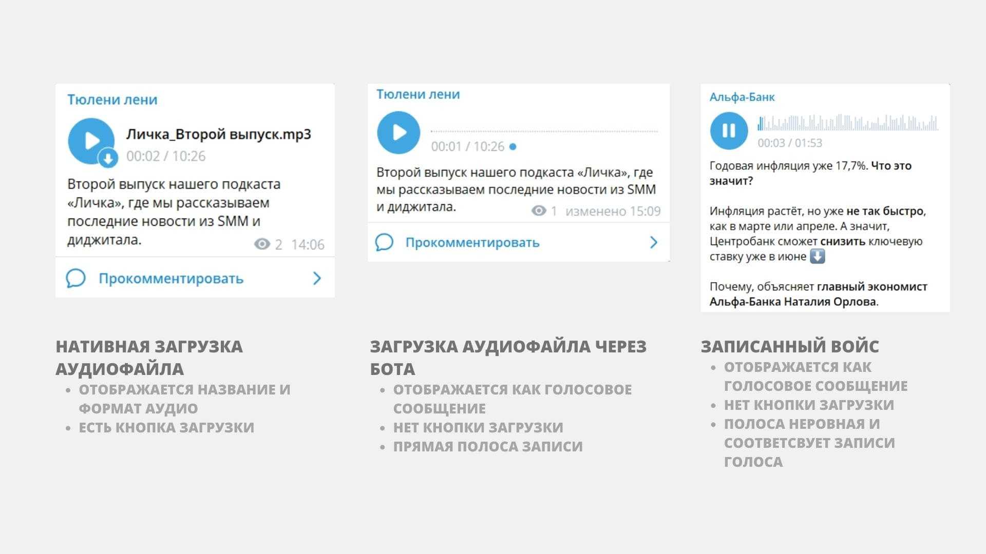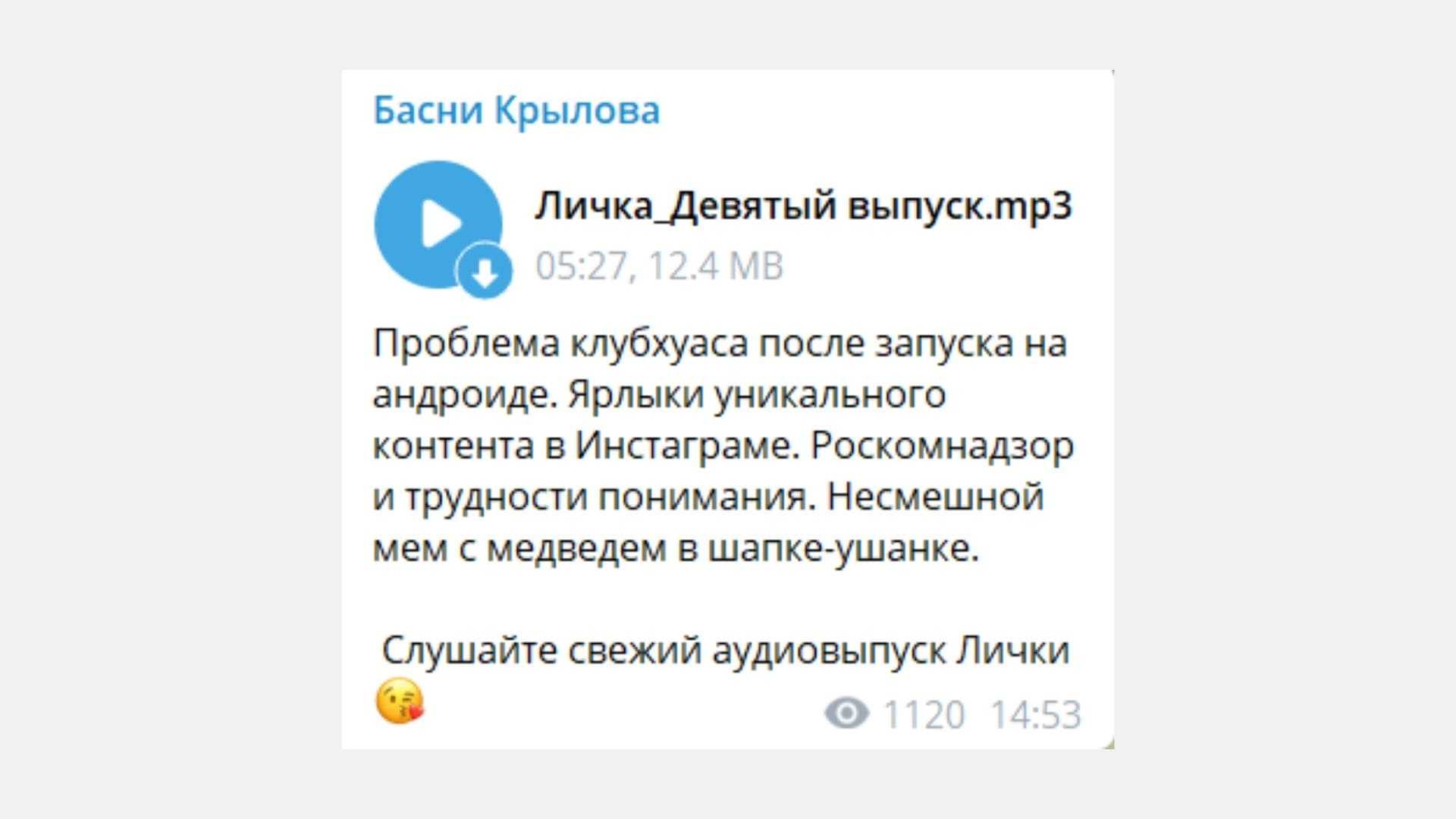 Это не голосовые сообщения, а отдельные аудиофайлы, которые также проигрываются плеером Телеграма. Годятся не только для музыки, но и для подкастов. Например, на нашем телеграм-канале «Басни Крылова» мы еженедельно выкладываем тематический новостной дайджест.