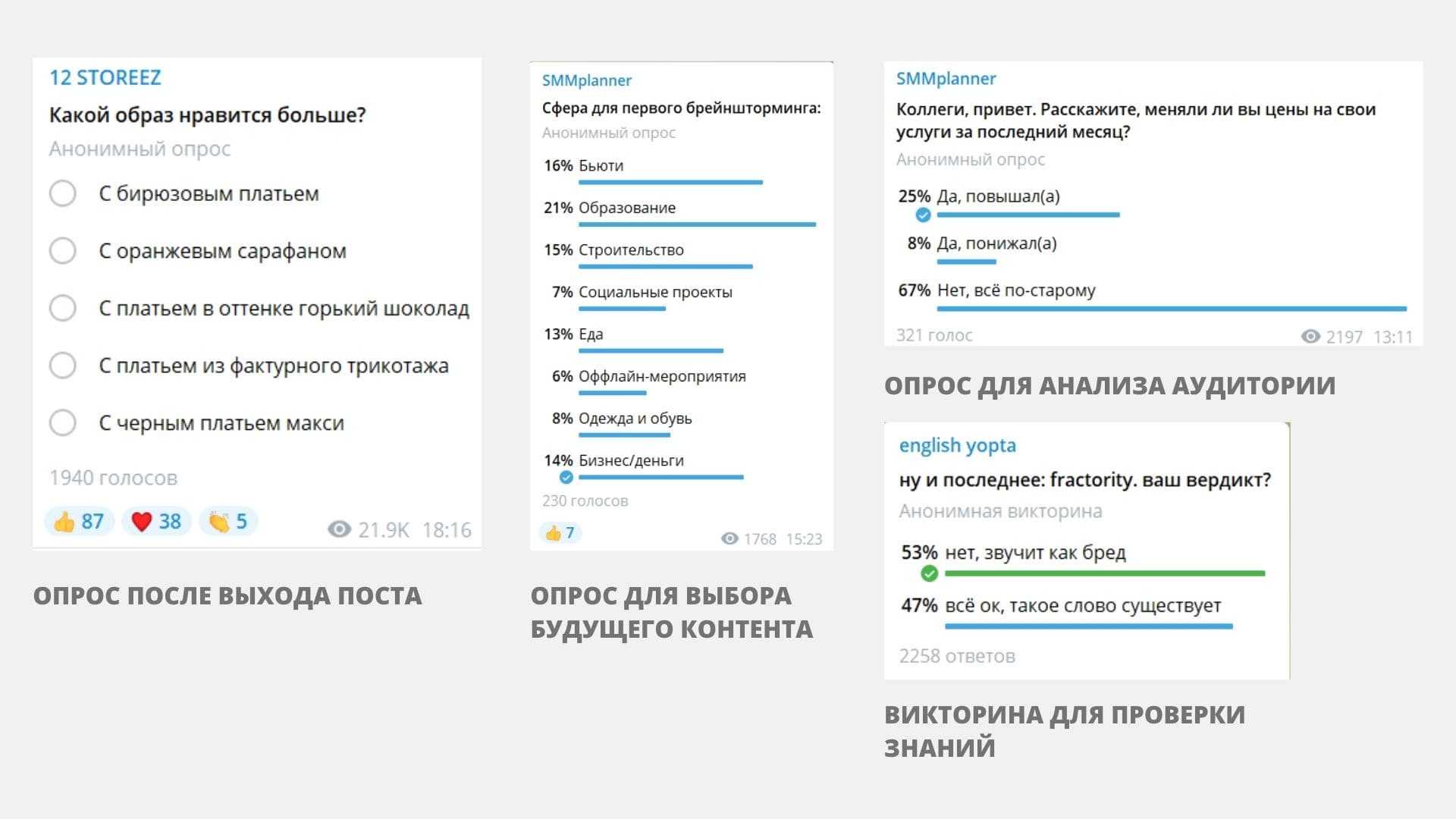 Опросы можно использовать в качестве обратной связи и дополнительного элемента интерактива. Например, эту идею для Телеграма можно реализовать для бизнес-аккаунтов, где опросы выходят после поста и собирают реакции. Мы в SMMplanner устраиваем голосования перед постингом следующего контента – это позволяет аудитории принять участие в формировании ленты.