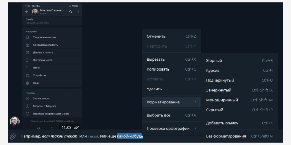 Большинство настроек работают и в десктопной версии. Например, в версии Телеграма для десктопа нажмите правую кнопку мыши, выберите «Форматирование» и подберите нужный эффект.