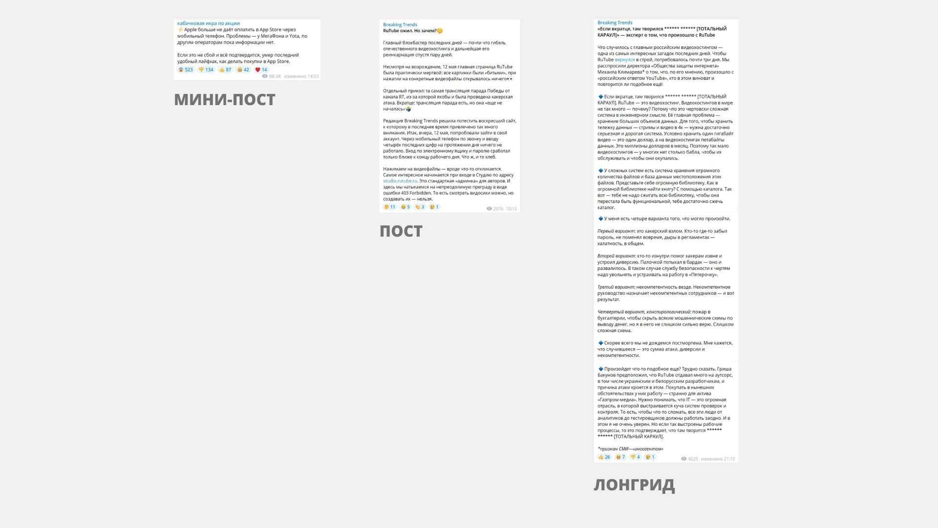 Самостоятельная единица контента без изображений, только текст. Используются форматирование, ссылки, эмодзи, хештеги.