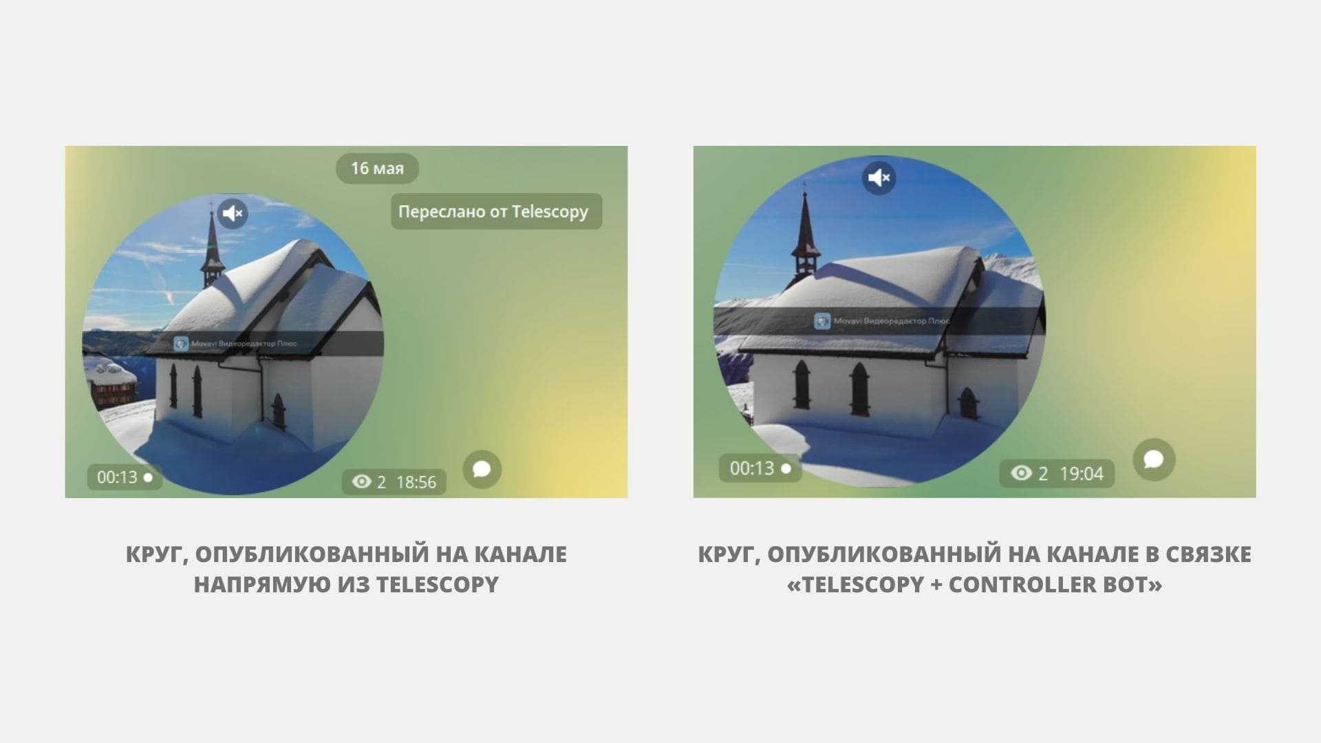 - Репостните преобразованное видео из Telescopy в бота, созданного с помощью Controller Bot, который ранее был привязан к каналу. Так вы можете убрать плашку «Переслано от», и видео в ленте будет отображаться нативно.