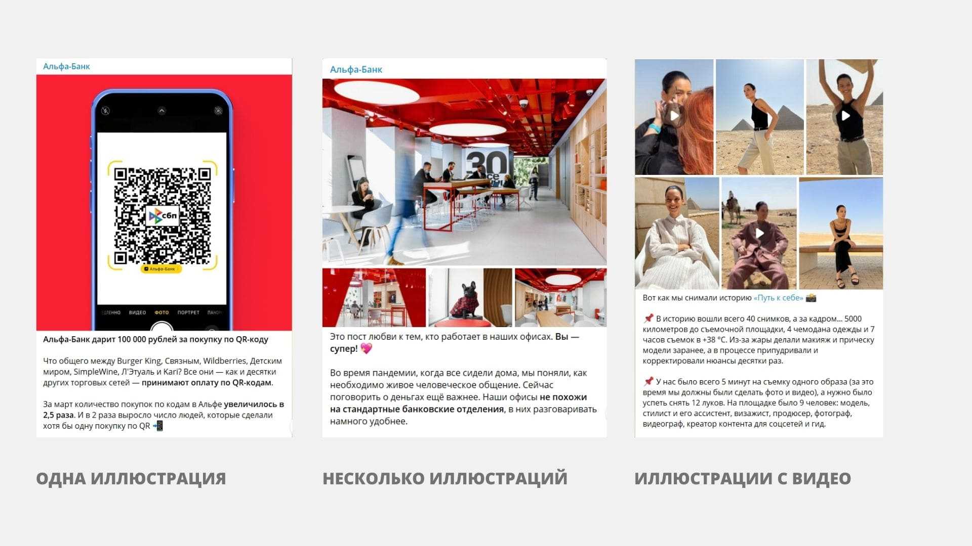 Изображение выступает обложкой к текстовому посту длинной до 1024 символов. Картинок может быть несколько, можно добавить видео.