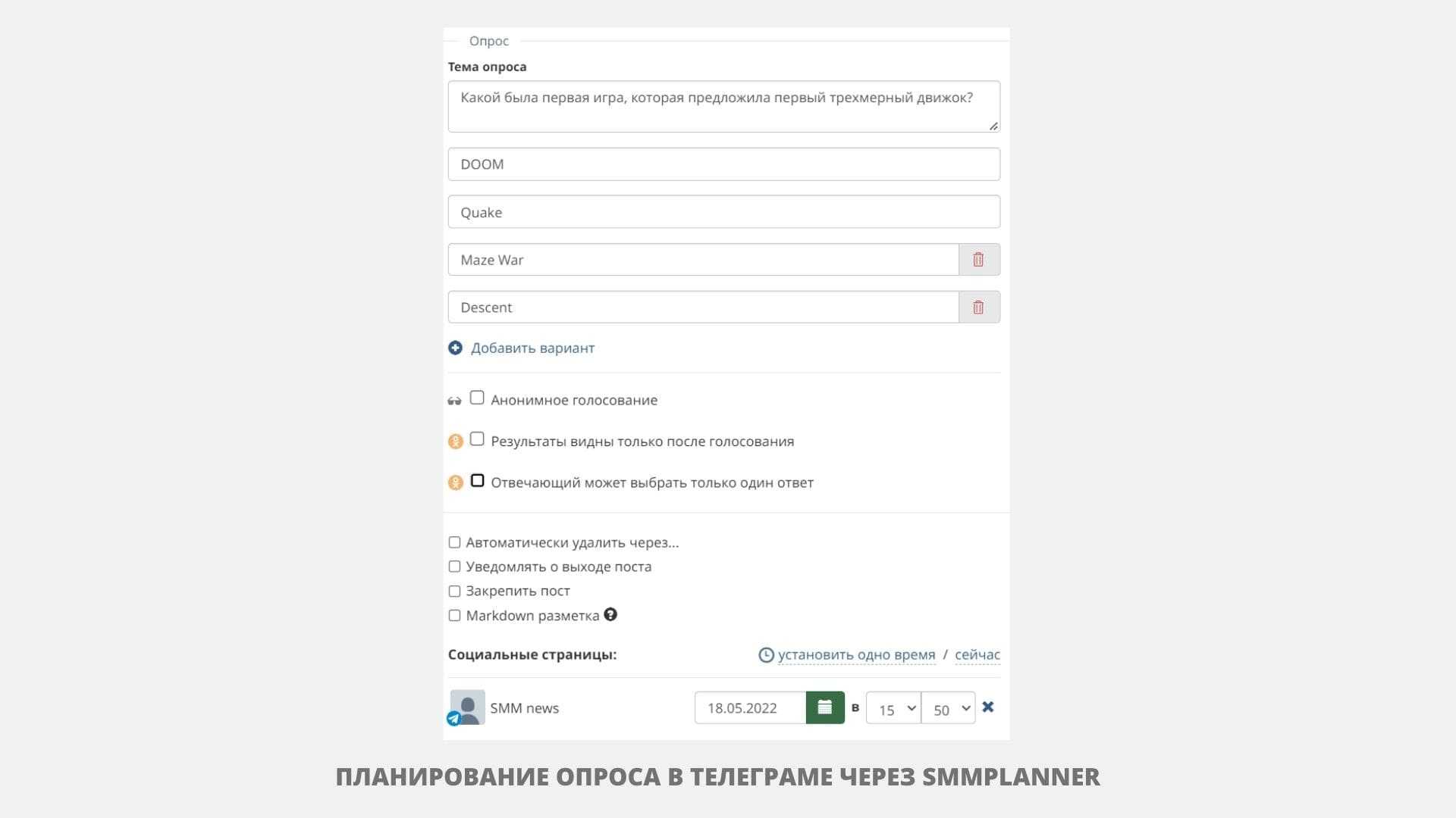 Опубликовать отложенный опрос в мессенджере не получится, но можно это сделать через SMMplanner – подключите свой канал к нашему сервису, выберите формат «Опрос» в окне редактора отложенных постов и поставьте таймер выхода. Пока что функционала для создания викторин нет, но зато есть другие интересные функции – автоматический репост в другие соцсети, дублирование контента и удобная лента планирования контента.