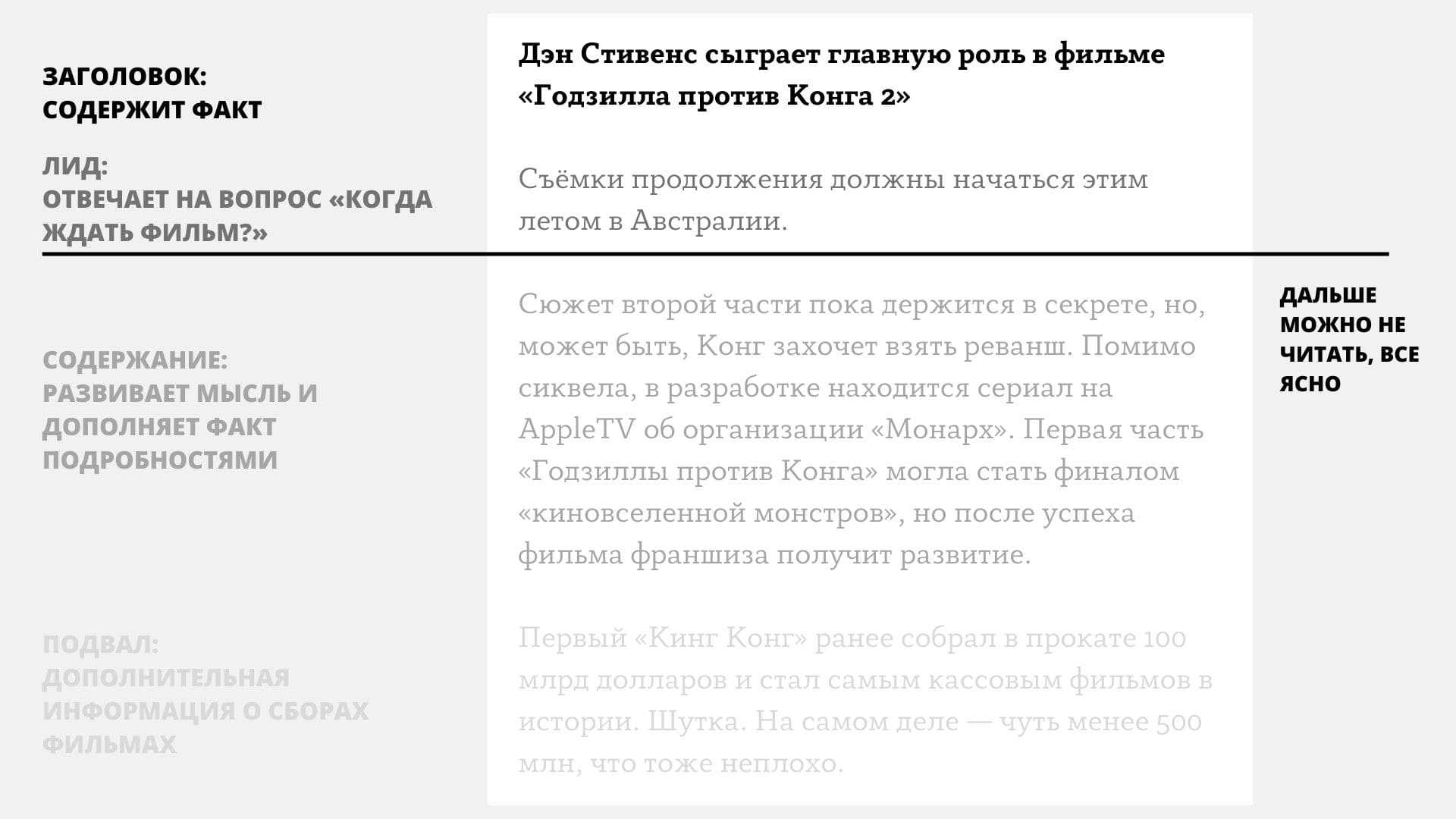 Лид – вторая по важности часть новости, которая в идеале должна ответить на все вопросы так, чтобы дальше читать текст было необязательно.