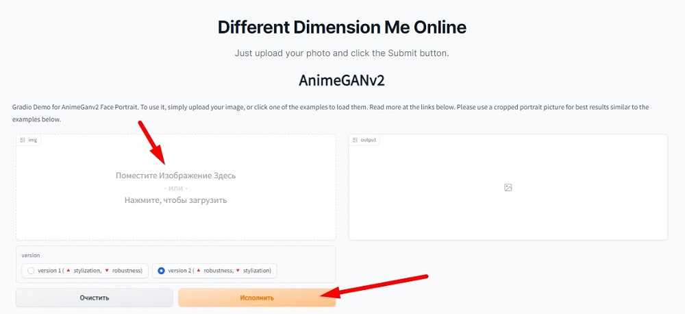 - 2 пустых поля на рабочем экране после обновления страницы. В левое нужно загрузить фотографию со своим портретом или изображением друга. В правом через несколько секунд появится аватар в стиле аниме.