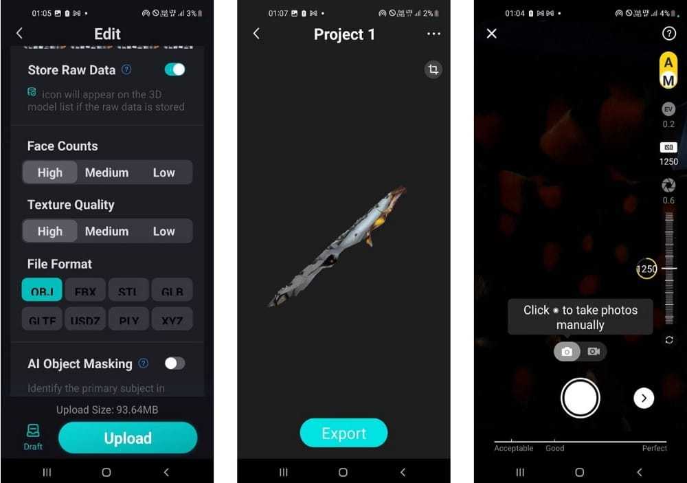 Для начала вам нужно сделать не менее двадцати качественных фотографий с разных ракурсов. Затем выберите тип качества текстуры — высокое, среднее или низкое, а также другие параметры, такие как настройки камеры и экспозиции, по вашему выбору, и нажмите Скачать. Приложение автоматически определяет ключевые точки на изображениях и создает из них 3D-модель.