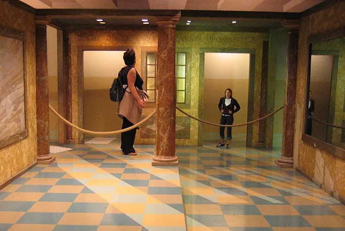 На фото ниже, сделанном в одном из музеев в Париже, человек с левой стороны кажется намного выше в сравнении с персоной справа. Но в реальности это не так. Такое впечатление создается из-за так называемой «Комнаты Эймса», за счет которой и достигается иллюзия резкого несоответствия в размерах.