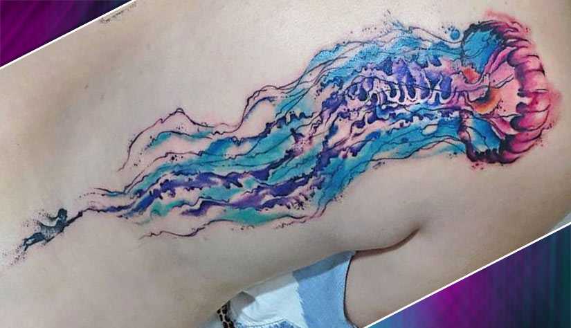 Интересен вариант с изображением морского существа с большим телом и тонкими щупальцами в технике акварель. Большой и длинный эскиз на ребрах или на спине выгодно подчеркнет изящность и плавный силуэт женской фигуры. Миниатюрное изображение будет кокетливо и мило смотреться на запястье.