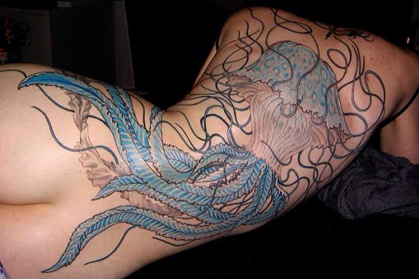 В морях и океанах можно встретить гигантских медуз, габариты которых впечатляют даже опытных моряков. Длина щупалец таких монстров может достигать 5 – 10 метров, и они представляют угрозу даже для человека. Такие создания, в отличие от какого-нибудь Ктулху, вполне реальны. Они часто становятся причиной серьёзных травм и даже гибели, вызывая паралич. Хотите татуировку с настоящим монстром глубин? Вот вам вариант.