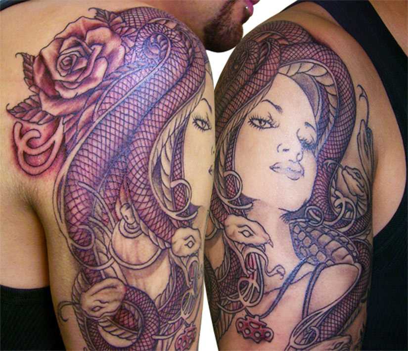 В эскизах таких тату особое внимание уделяется рисункам змей на голове, ведь только по ним можно определить, что перед нами – не обычное изображение красивой женщины, а рисунок чудовища.