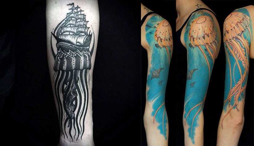 Татуировки с медузами обычно имеют продолговатую форму, поэтому для них лучше выбирать соответствующие места на теле — бедра, икры, плечи и предплечья. Если планируется работа большого размера, она будет отлично смотреться на ребрах.