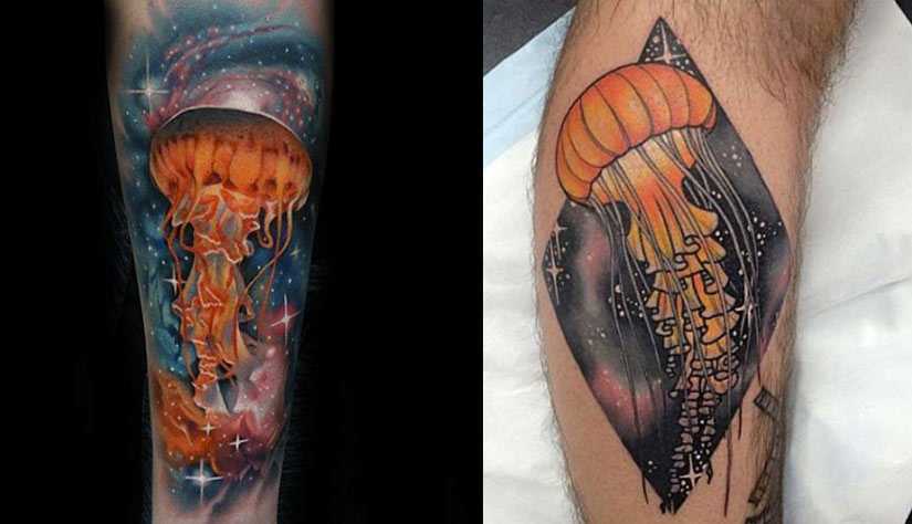 Эскиз медузы в стиле акварель (см. фото в галерее) смотрится очень эффектно и на мужском, и на женском теле. Можно выбрать фото реального существа, а можно добавить фантастические элементы (например, медуза, летающая в космосе или обвивающая щупальцами земной шар). Подобное тату подойдет творческим неординарным людям.