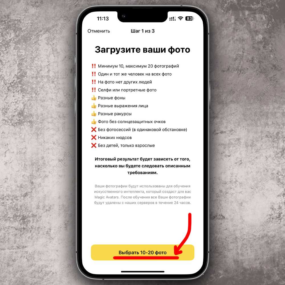 3. Читаете условия: для максимально красивого результата нужно загружать фотографии с лицом в разных ракурсах, желательно без очков, никаких «нюдсов» и прочей пошлятины, без посторонних людей в кадре и прочие логичные требования.