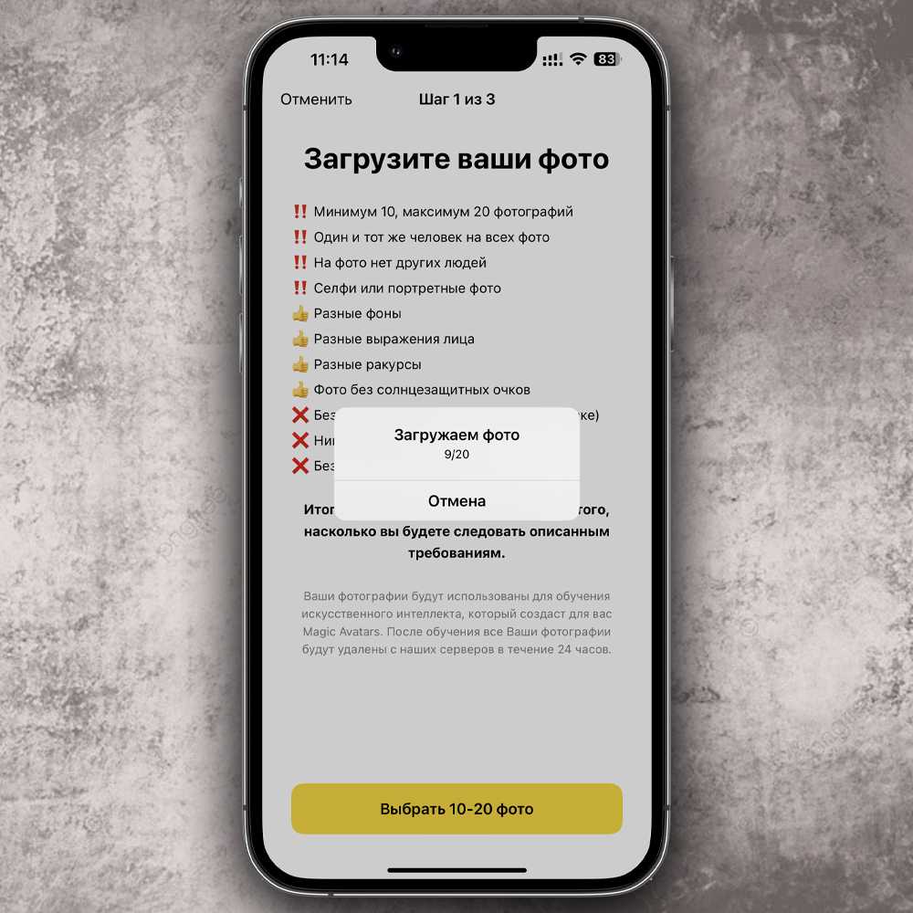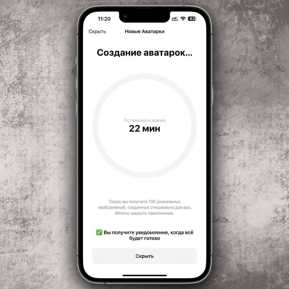 Нужно просто выбрать и загрузить в приложение от десяти до двадцати своих фотографий из медиатеки айфона и подождать 25 минут.