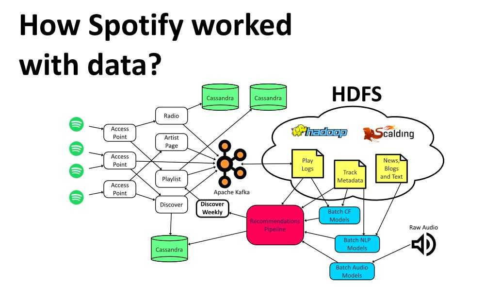 Чтобы рекомендации существовали, нужно для начала иметь, что рекомендовать, знать, кому рекомендовать и знать почему рекомендовать. Короче говоря, нужна система сбора и хранения информации. У Spotify она достойна не одной отдельной статьи, но мы постараемся описать ее кратко.