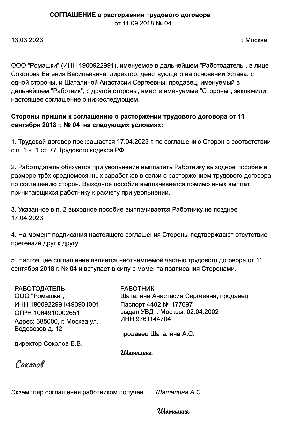 Обычно работника увольняют по соглашению сторон, когда хотят компенсировать расставание выходным пособием. Чтобы не лишиться такой компенсации, нужно правильно составить соглашение об увольнении и уметь отстоять свои права — об этом в Т—Ж есть отдельная статья.