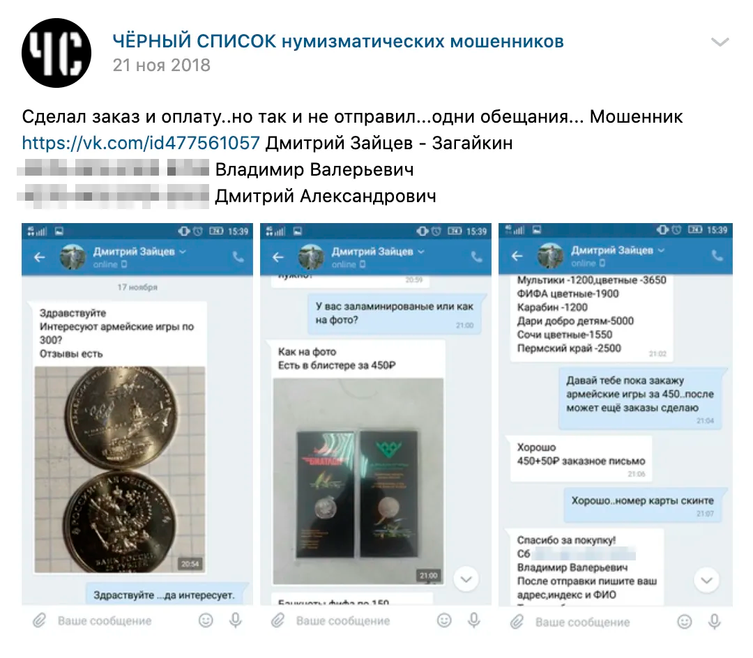 Если покупаете монеты, поищите нумизматические сообщества, которые отслеживают мошенников и формируют черные списки нечестных покупателей
