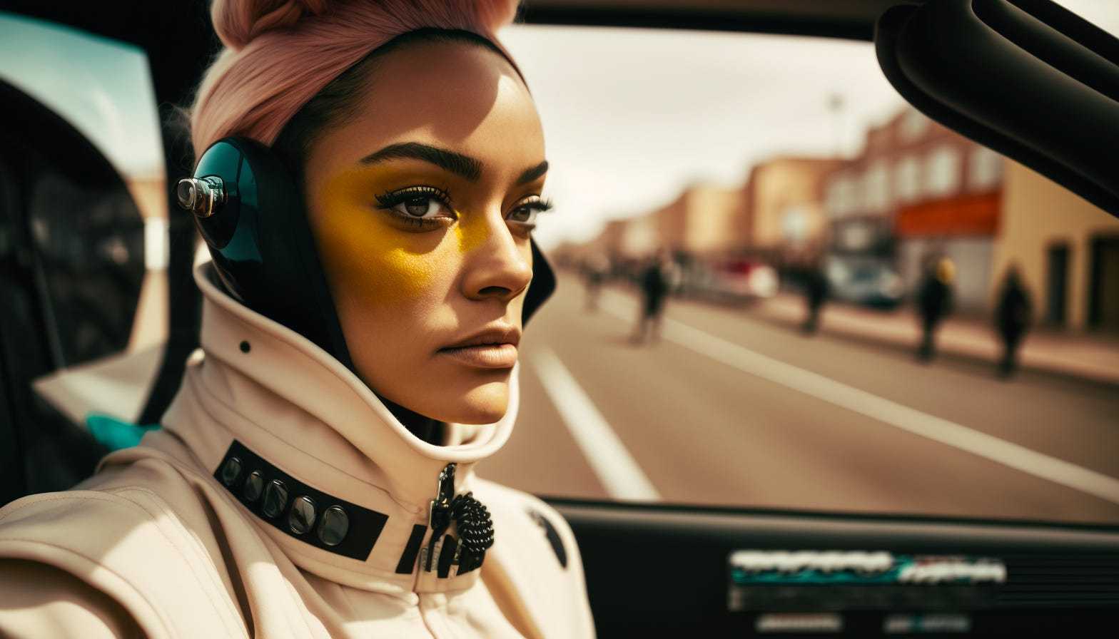 A woman driving a car, a woman sitting in the driver seat holding the steering wheel, wearing a racing outfit, and wears a white balaclava, ultra-wide shot from outside the car, center view, shot on Fujifilm Pro 400H —ar 16:9