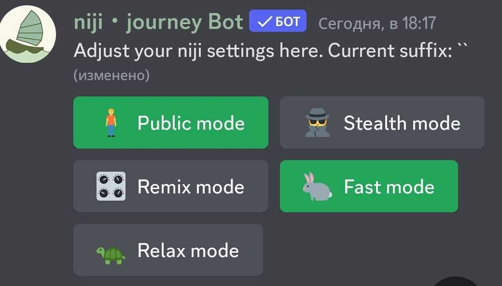 Важно также отметить, что при генерации изображений на сервере Niji Journey, вы будете тратить свои лимиты Midjourney. В настройках сервера (/settings) доступны следующие опции:
