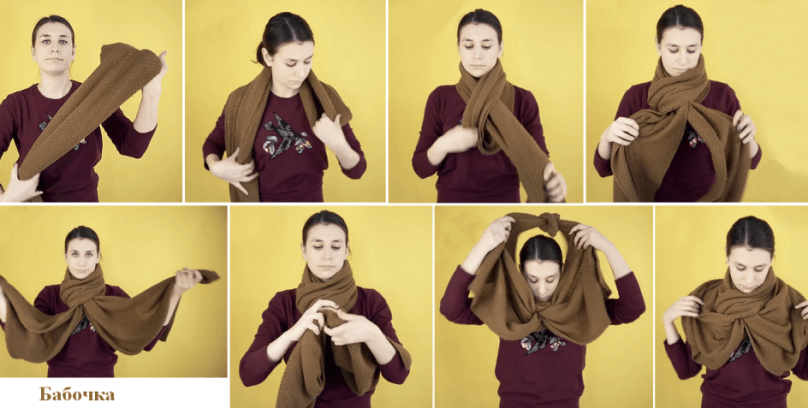 Техника завязывания таких шарфов зависит от их размера. Узкие шарфы — трубы, одеваются на голову, просто в виде капюшона.