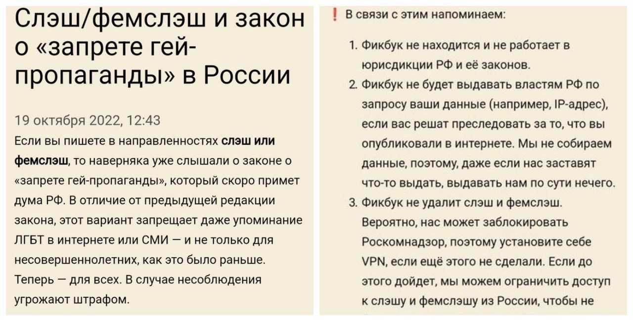 Как «Фикбук» обещал пользователям защиту от закона об ЛГБТ-пропаганде. Осенью компания уверила пользователей, что находится вне юрисдикции России, поэтому закон о «запрете ЛГБТ-пропаганды» не коснётся авторов, которые пишут в жанре слэш или фемслэш. Тогда фикрайтеры похвалили «Фикбук» за верность пользователям и смелость.