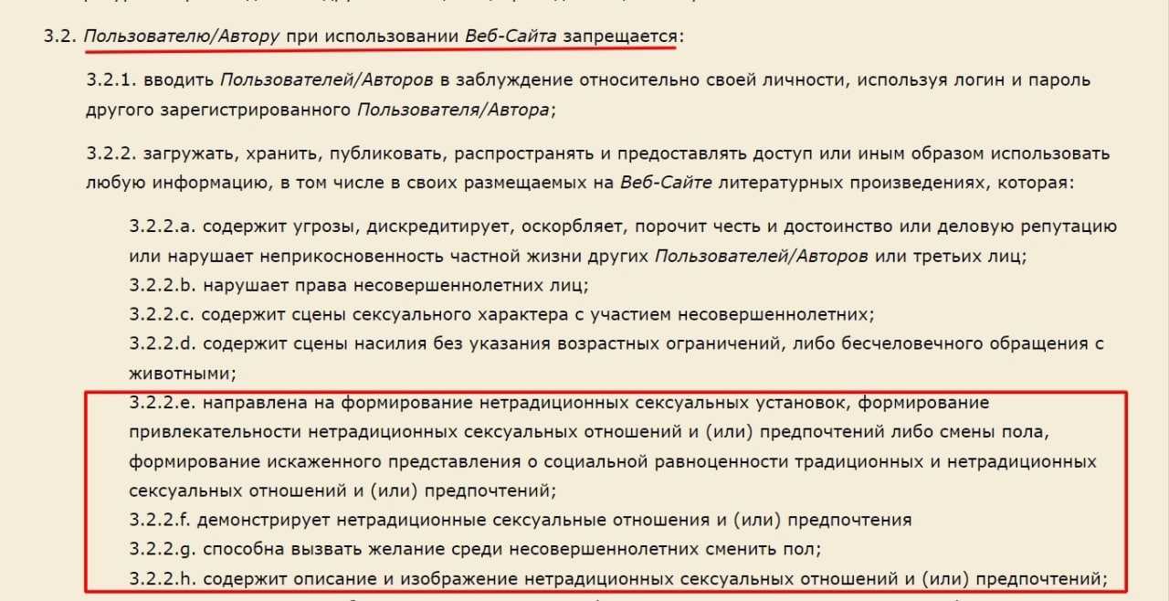 Какие поправки в соглашении «Фикбука» возмутили пользователей. Фикрайтеры заметили, что в онлайн-архиве фанфикшена «Фикбук» изменилось пользовательское соглашение. В договоре появился пункт, запрещающий авторам размещать произведения, в которых содержатся сцены описания гомосексуальных отношений.