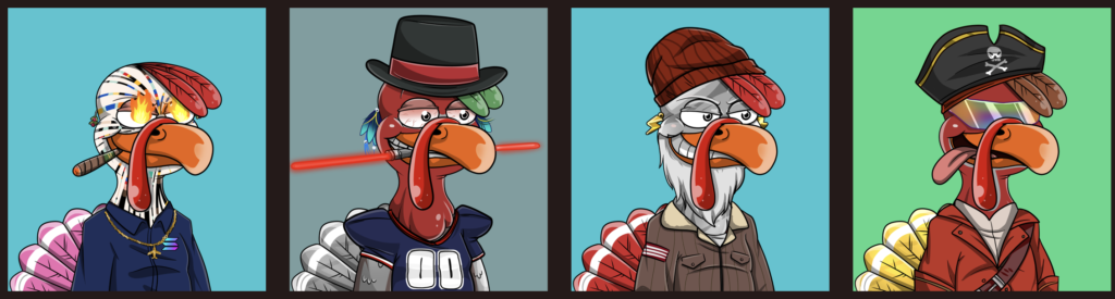 Trotting Turkeys — это коллекция 5555 NFT, целью которой является самый благотворительный проект NFT на блокчейне Solana.