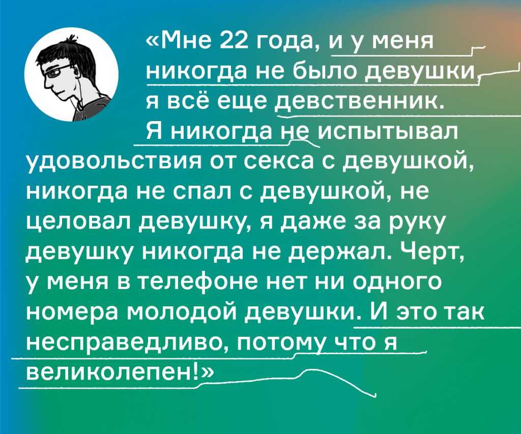 На специализированных форумах и на просторах Reddit’а можно найти тысячи аналогичных сообщений, но конкретно эти слова принадлежат герою инцеловского движения Эллиоту Роджеру
