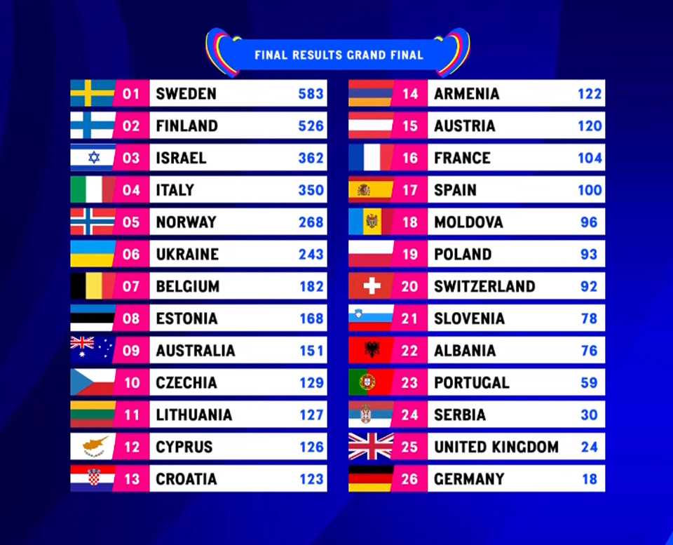А эта итоговая таблица с полными результатами Евровидения 2023. Как мы видим, отрыв 5 от 4 места достаточной приличный. Ну а последнее место, 26-е в этом году заняла Германия. Эту страну с песней «Blood & Glitter» представляла готик-индастриал-метал-группа Lord of the Lost. Однако тяжелая музыка на этот раз на Евровидении не зашла.