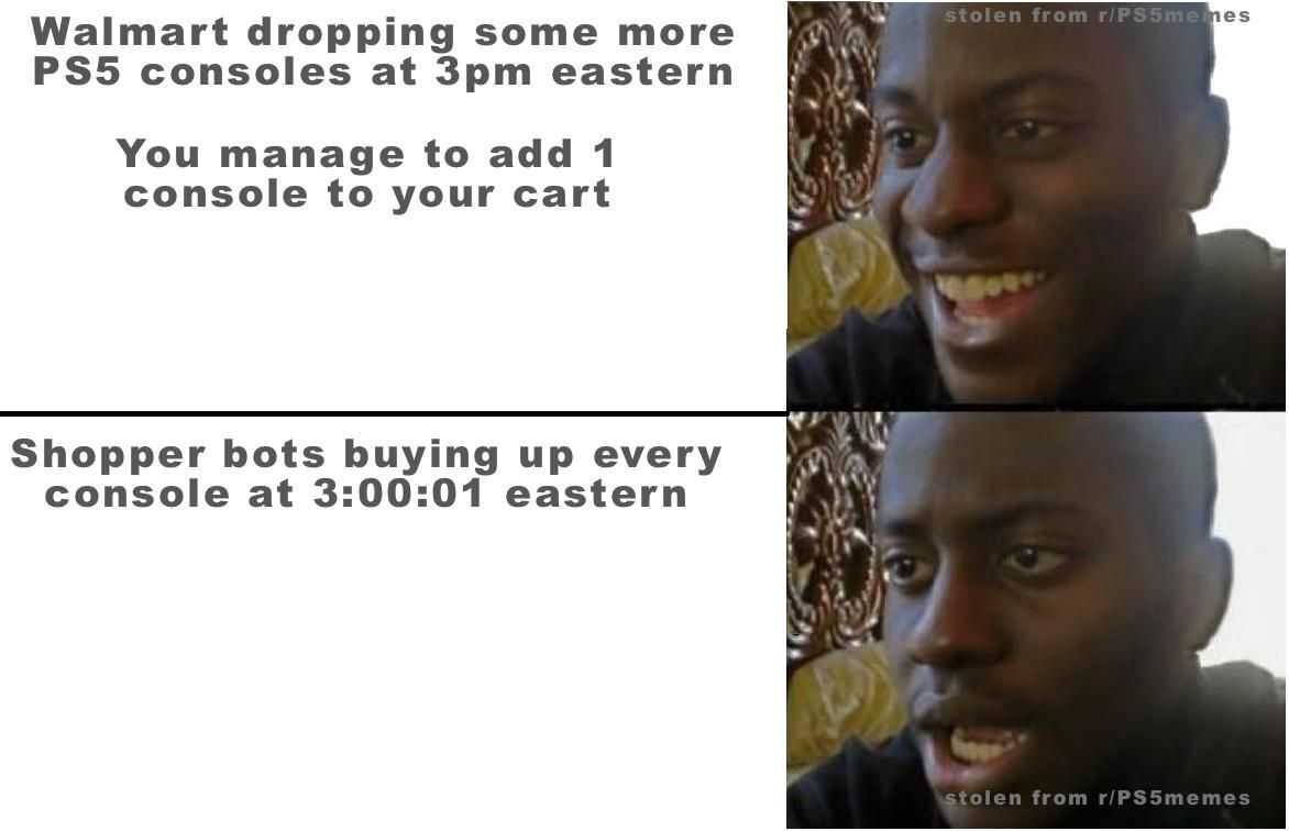 Этот мем вызвал ненависть миллионов геймеров. Прямо сейчас существует проблема с роботами, в самом дурацком смысле слова «проблема с роботами». Эти подлые спекулянты настраивают ботов для немедленной покупки любых консолей PS5 и Xbox Series X, которые есть в списке онлайн. Это привело к тому, что фанаты получили момент радости, прежде чем он был оторван от них в тисках нескольких строк кода.