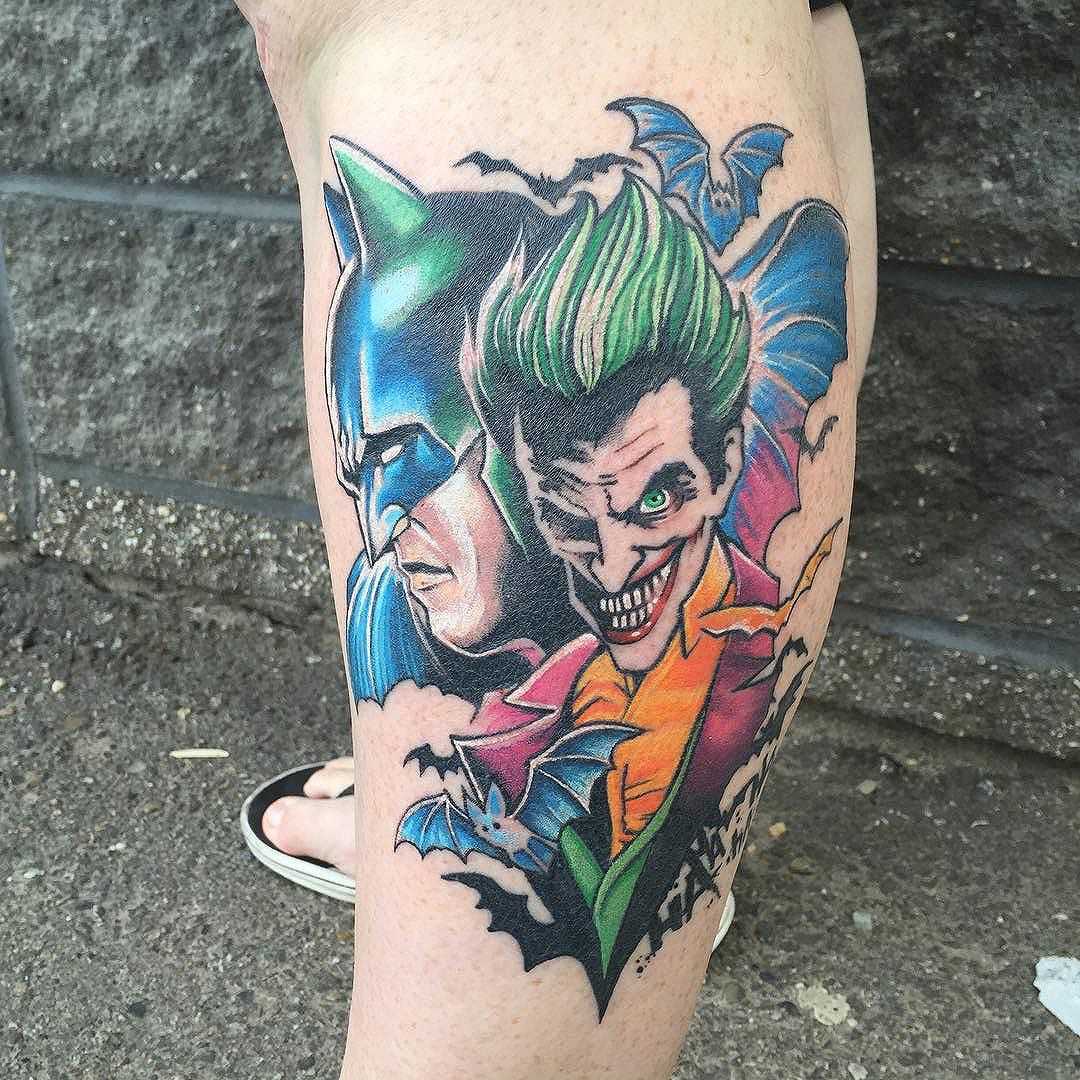 В большинстве своем, парни выбирают монохромные Джокер тату, чтобы показать мрачность образа. Лишь иногда добавляют яркие цвета: красный, синий, зеленый – но только для показа контрастности, драмы, агрессии.