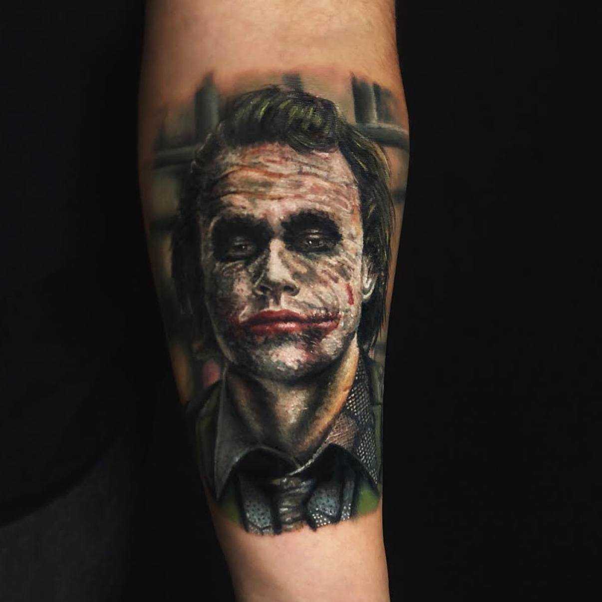 Для таких татуировок используют красивые оттенки, привлекающие внимание. Черно-белый образ — это ночной Джокер, зловеще-мрачный, холодный и расчетливый