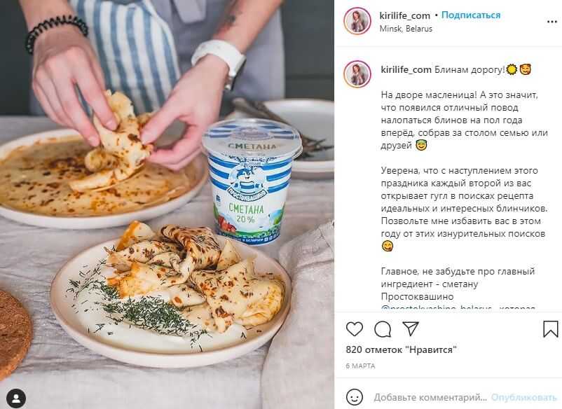Фудблогер и автор рецептов Таня Киреева советует подписчикам использовать для приготовления сытных блинов сметану «Простоквашино»