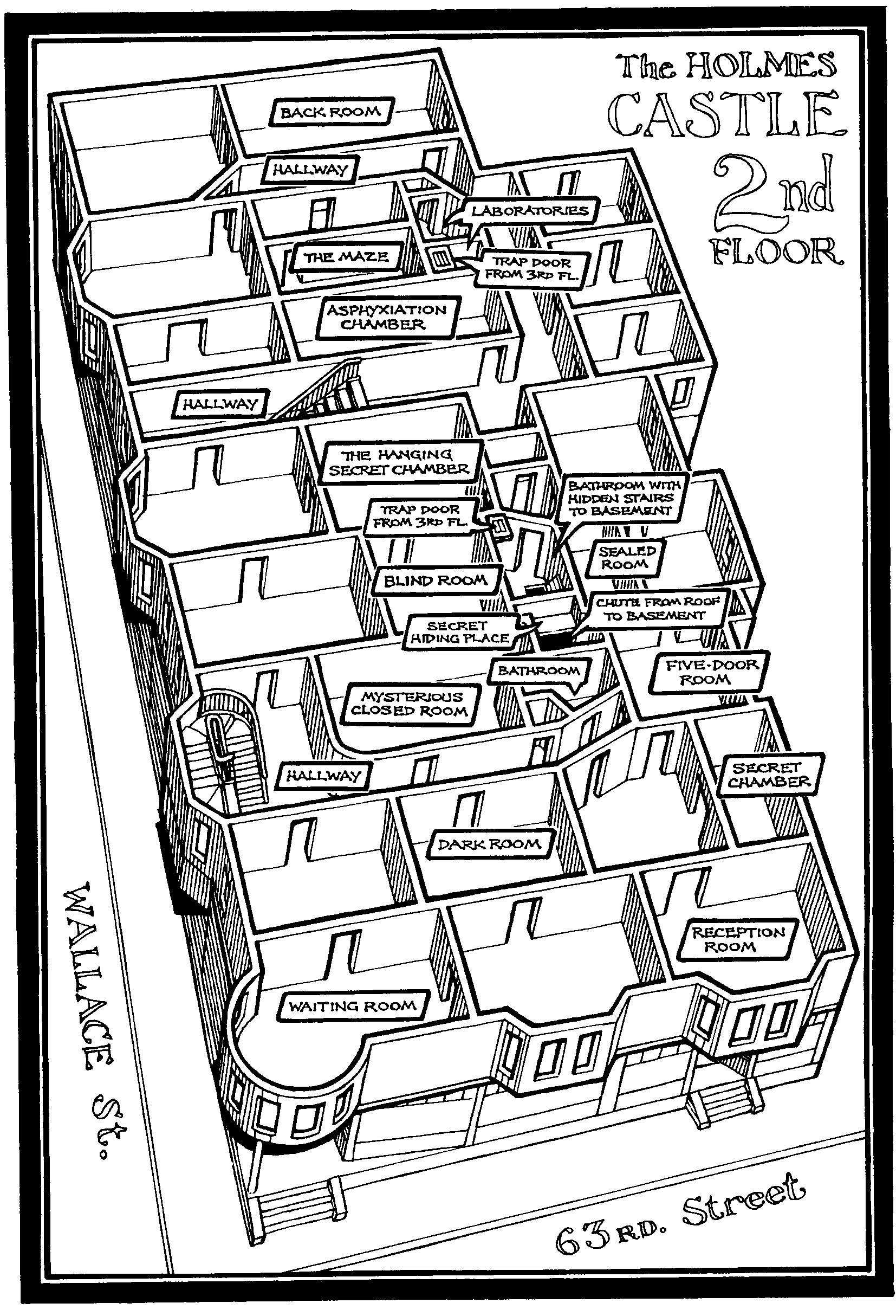Во время его строительства Герман, лично следивший за ходом работ, не изменял себе: обсчитывал, грабил и обманывал. План будущей постройки был известен только ему, плюс он вносил правки в чертежи прямо на стройке. В среднем он менял рабочих каждую неделю, со скандалом увольняя старую команду: так никто не мог представить, как именно потом будет выглядеть его отель. Полиция проводила в «Замке» обыски несколько раз и ничего подозрительного, помимо разве что лёгкого сумасшествия в общей планировке, не замечала. Пока однажды не наткнулась на потайную дверь, ведущую в смазанную маслом шахту, уходящую куда-то в тёмную тишину. Такие же были и в некоторых других комнатах. Место для мусора? Или грязного белья? Сорвав замки на дверях подвального помещения, они обнаружили прозекторский стол, стоящий точно под квадратным отверстием в потолке. То, что падало сверху, должно было интересовать хирурга. Здесь же неподалёку находилась настоящая кремационная печь с весьма оригинальной системой вентиляции и несколько резервуаров с кислотой и негашёной известью.