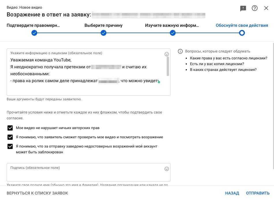 Как рассказала подруга, Content ID может ошибиться, а лейбл не проверяет, действительно ли использовали его трек, и просто высылает претензии всем подряд. Подруга была уверена, что трек не принадлежал лейблу: она нашла его у исполнителя на «Саундклауде» — в описании было сказано, что все могут беспрепятственно использовать эту музыку для своих роликов на «Ютубе». Поэтому подруга решила открыть диспут — обжаловать претензию.