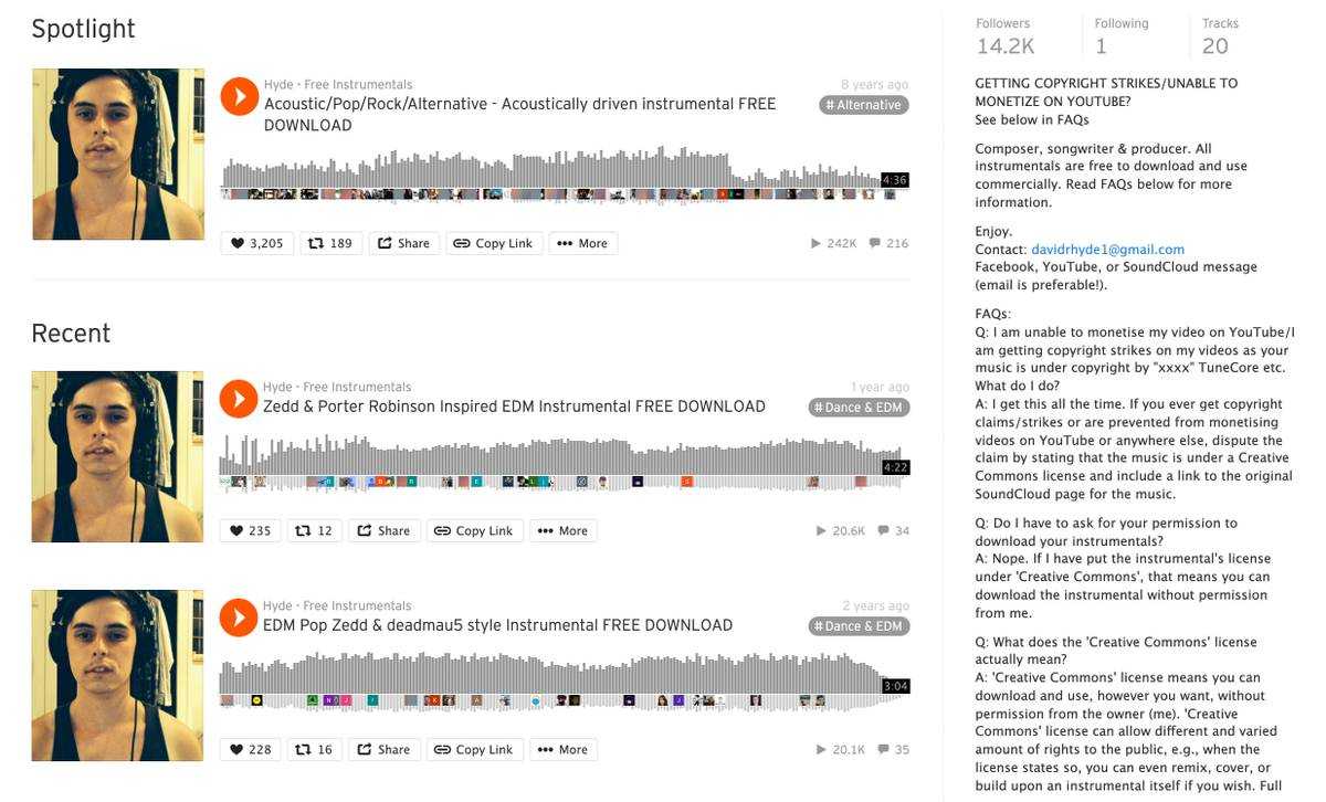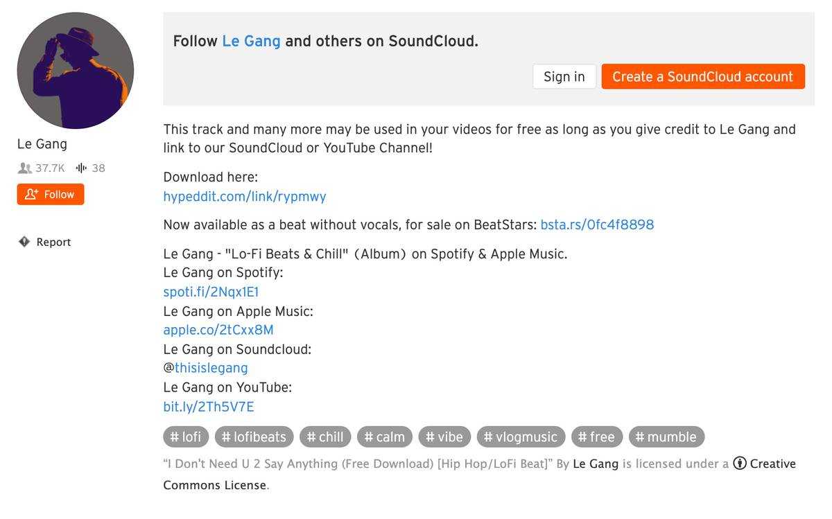 Как я писал выше, в качестве фоновой музыки я использую треки, которые нахожу в открытом доступе на «Саундклауде» или в бесплатной аудиобиблиотеке «Ютуба». В «Саундклауде» авторы треков подписывают, можно ли использовать их трек и какая у него лицензия Creative Commons — эта организация разработала разные виды лицензий для авторов, которые хотят, чтобы их творчество было в открытом доступе.