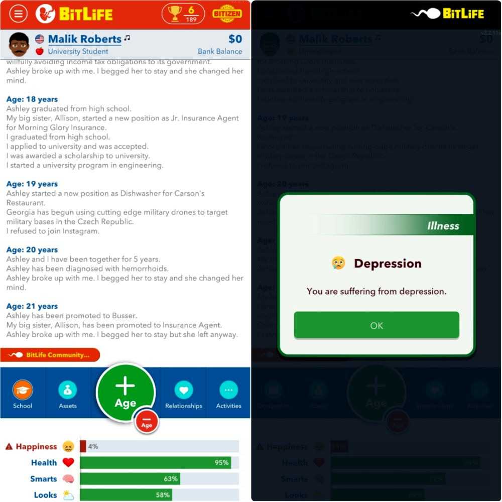 Как хорошие решения ведут к лучшим возможностям, очень легко перейти от плохого к худшему.. Например, если уровень счастья вашего персонажа станет слишком низким, он может впасть в депрессию, и если не принимать меры, это может привести к тому, что ему понадобится психиатрическая лечебница. Лучший способ «вылечить» их депрессию — увеличить их счастье, но каждое увеличение будет меньше, чем обычно, потому что у них депрессия.. Это может означать отпуск, обращение за медицинской помощью или попытку изменить жизненный путь, и все это стоит больших денег