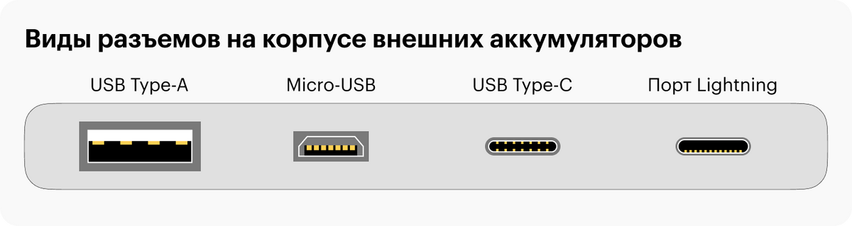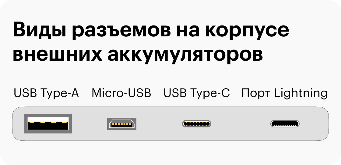 Чаще всего на корпусе внешних аккумуляторов встречаются три вида разъемов: