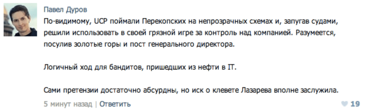 Сорвавшаяся сделка привела к ссоре Дурова с его компаньонами – Мирилашвили и Ливиевым. Они продали свои пакеты акций инвестфонду UCP и не известили об этом ни Дурова, ни Mail Group. Павел требовал признать сделку незаконной, поскольку перед продажей своих пакетов партнеры должны были предложить их другим акционерам.