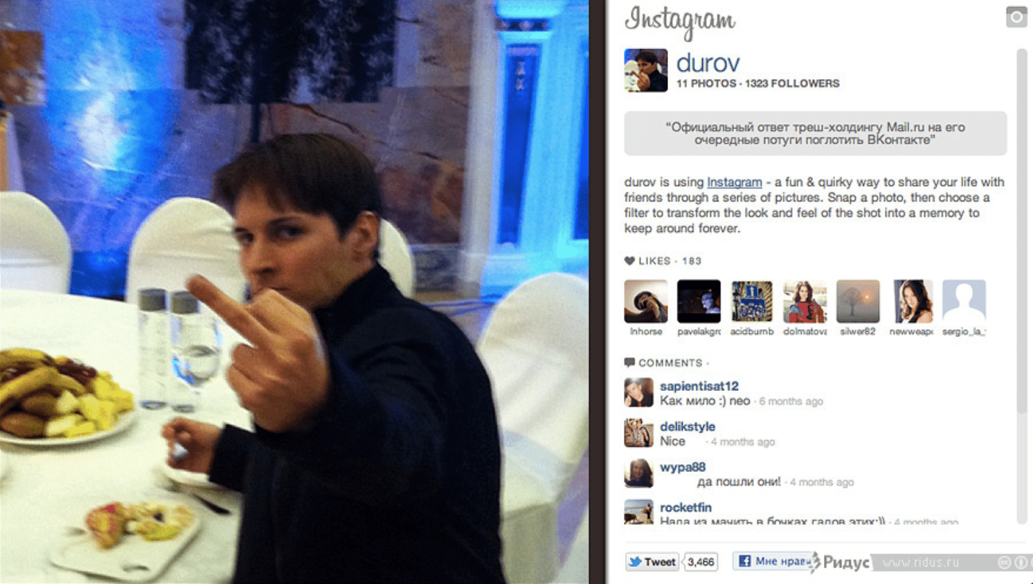 Через неделю после переговоров в Инстаграме Дурова появилось фото с поднятым вверх средним пальцем. В дополнение к неприличному жесту был выложен пост. В нем было сказано, что это официальный ответ Mail.ru на его намерения поглотить ВКонтакте.
