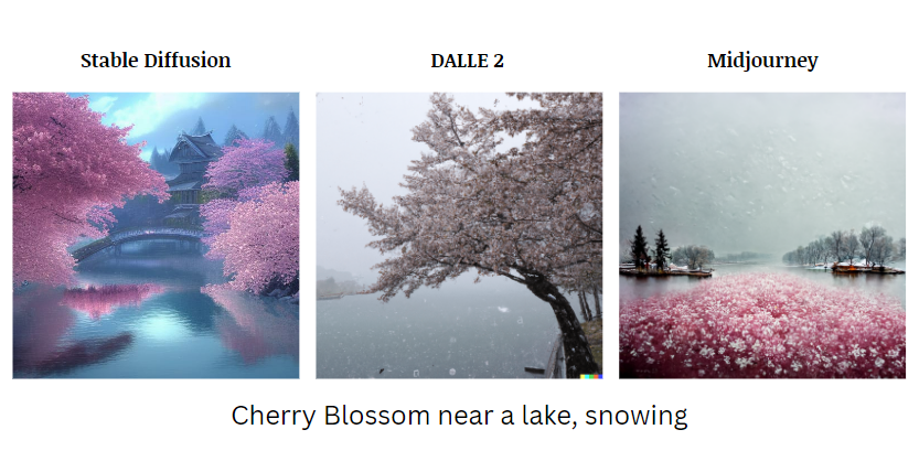 Примеры работ Midjourney, Stable Diffusion и DALL-E 2 по текстовому запросу.