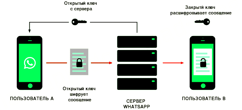 Рассмотрим, что такое сквозное шифрование в мессенджере WhatsApp. Итак, при инициализации переписки и на смартфоне отправителя, и на устройстве получателя генерируются два ключа, открытый и закрытый. Открытый отсылается другому участнику переписки, чтобы он знал, как кодировать сообщение, чтобы вы могли его прочитать. Точно такой же открытый код получаете и вы, благодаря чему получаете возможность дешифровки входящих данных.