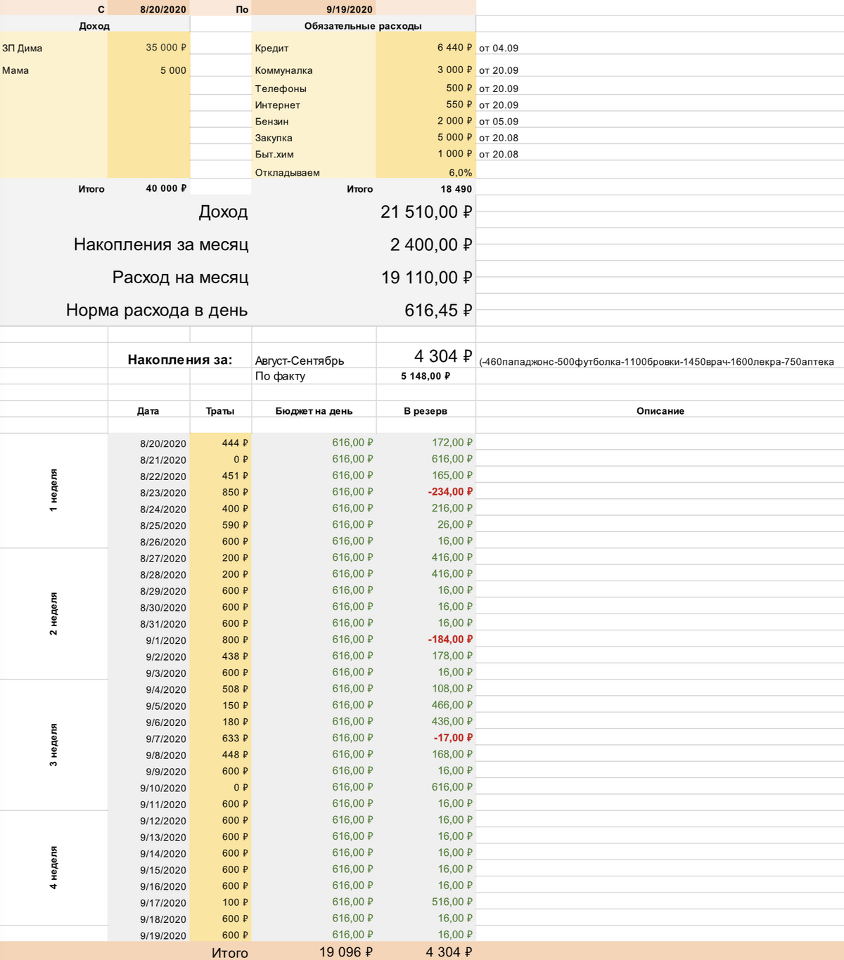 При необходимости мы уменьшаем ежедневные расходы до минимума — у нас порогом было 500 рублей на двоих — и стараемся больше накопить. Сэкономленные средства закладываем в резерв либо они уходят на следующий месяц — например, если планируется праздник или просто будет больше трат. Сейчас прибегать к таким способам приходится все реже, но случаются и форс-мажоры.