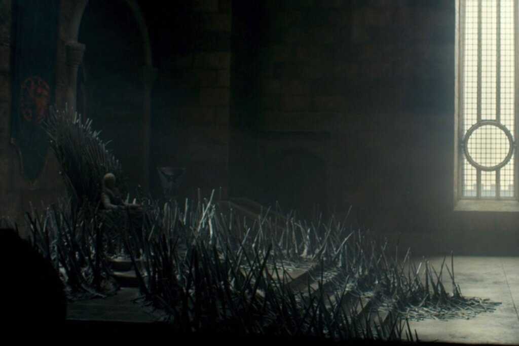 Сиденье большей высоты, и оно кажется более асимметричным, чем версия, которую мы знаем по «Игре престолов». Пол вокруг трона и ведущие к нему ступени, также покрыты оплавленными лезвиями, которые торчат, как ощетинившиеся колючие кусты ежевики.