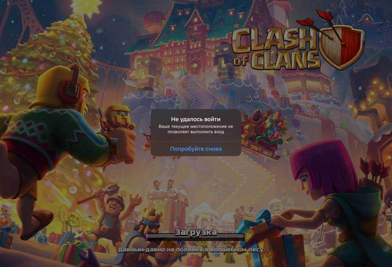 - Если вы случайно зашли в игру и увидели, что Clash of Clans пишет «Не удалось войти. Ваше текущее местоположение не позволяет выполнить вход», выйдите из нее и подождите некоторое время прежде чем входить с VPN.