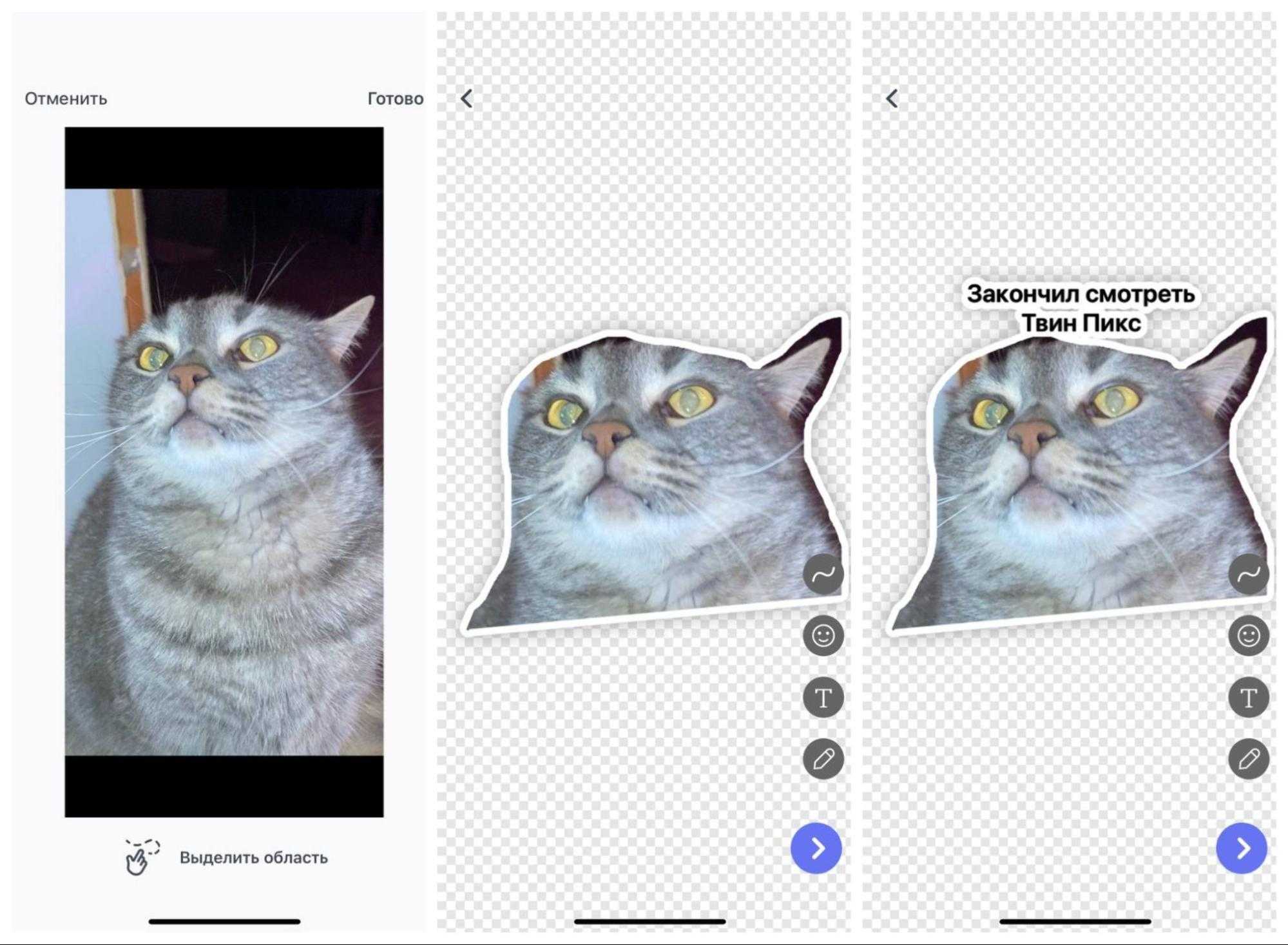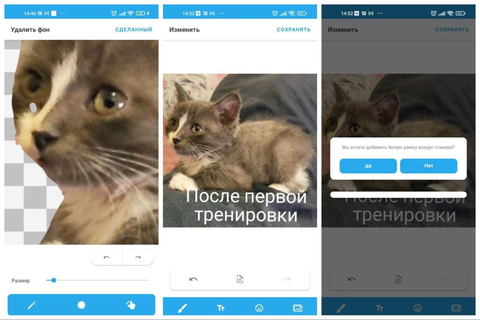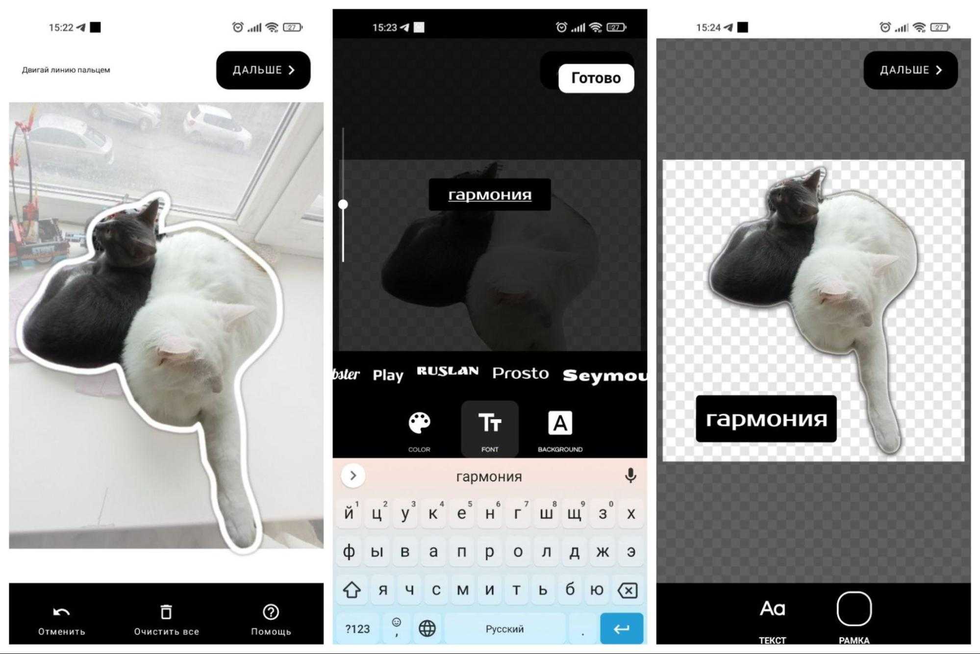 Принцип работы приложений заключается в том, что вы загружаете в него картинку и можете преобразовать ее в наклейку – при необходимости удаляете фон, делаете обводку, тени.