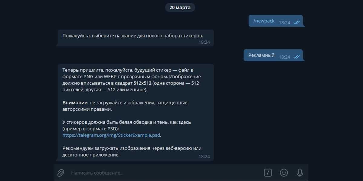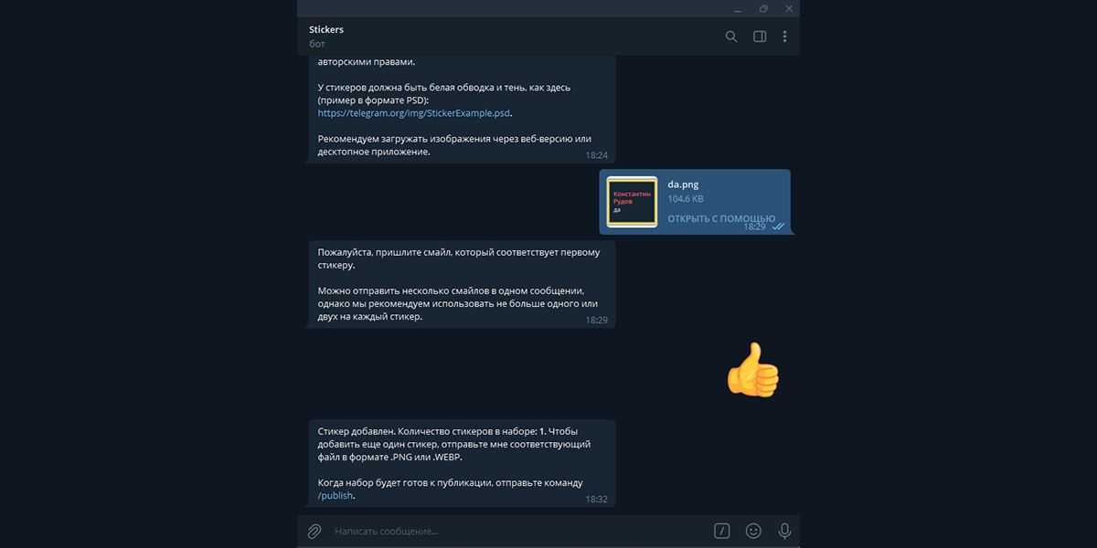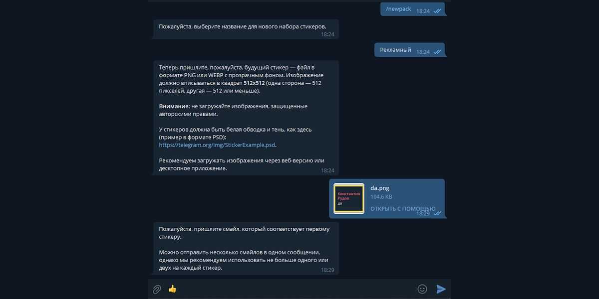 Отправив команду создания набора, можно приступать непосредственно к созданию стикеров. В общем виде добавление стикеров в набор выглядит так:
